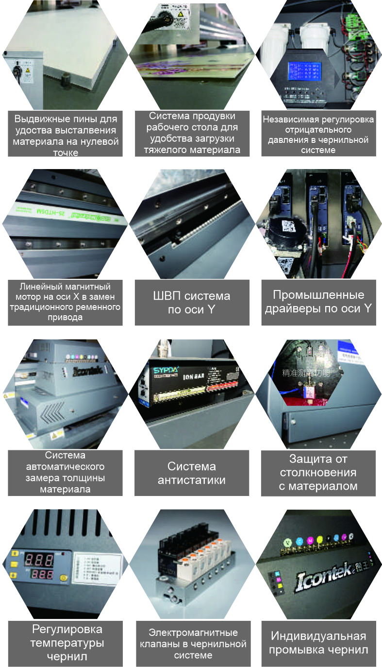 Для реализации скоростного потенциала печатающих головок Ricoh Gen6 на принтере применена система линейного электродвигателя и металлическая растровая линейка по оси X.
