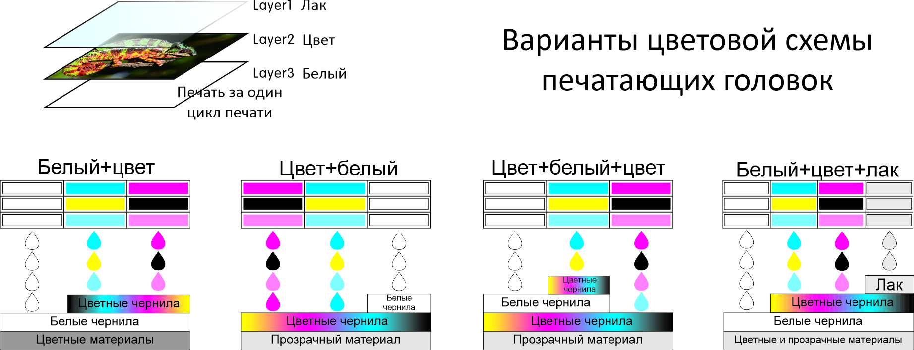 На принтере в стандартной модификации возможно установить до 10 печатающих головок с поддержкой различных цветовых конфигураций, это только CMYK, CMYK+Белый, CMYK+Белый+Лак, CMYK+Белый+CMYK. В соответсвии с запросом клиента возможно использовать принтер с максимальной производительностью в режиме печати цветом или при использовании белого и лака получить большую универсальность.