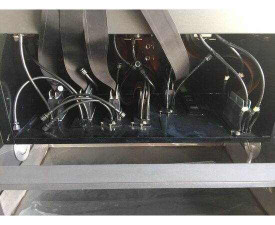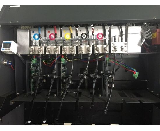 - Возможность установки печатных голов Японской фирмы Ricoh Gen5 в количестве до 8шт, расположение голов и цветов в шахматном порядке СMYK x 2 или CMYK Lc Lm White Varnish.