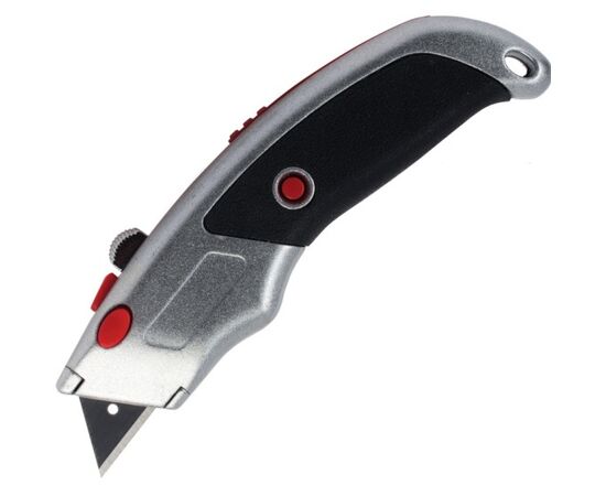 Профессиональный нож с металлическими направляющими, фиксатором и карманом для запасок применяется в отделочных работах для резки гипсокартона, гипсолитовых плит, кровельных материалов, пластика, дерева, картона, бумаги, линолеума, ковровых покрытий, пленок.