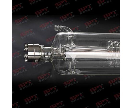 Лазерные трубки SPT проходят тщательный контроль качества, на видео и фото тестирования этих трубок, видно что значение мощности на момент тестирования, даже выше заявленной, это значение фиксируется на этикетке каждой трубки. Трубки малой мощности до 80W включительно оснащены металлическими наконечниками с водяным охлаждением. Также стоит отметить что высоковольтные провода на лазерных трубках SPT монтируются уже на заводе, что обезопасит конечных пользователей при установке новой лазерной трубки в станок, теперь не нужно беспокоиться о том, как прикрепить провода к контактным штырям, скруткой ли, или пайкой, не нужно беспокоиться о возможном перегреве контактных штырей при пайке и разгерметизации трубки, просто установите трубку в держатели и соедините между собой высоковольтные провода станка и трубки.
